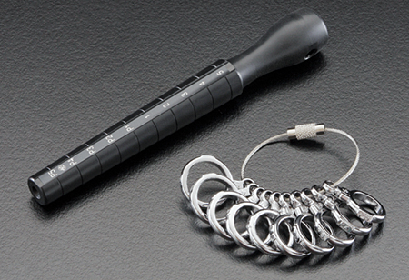 | 小指(ピンキー)の寸法測定専用の、リングゲージ&ゲージ棒です。ゲージ棒はリングを傷めない硬質プラスティック製です。 |
